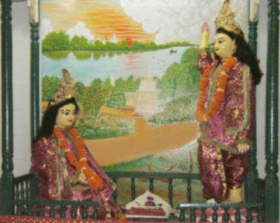 Ðто Божества Адвайта Бхавана. Шри Адвайта Ачарья, молящийся о нисхождении Шри Чайтаньи Махапрабху, который стоит справа.